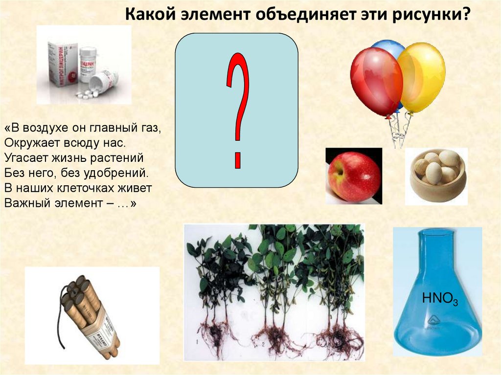 Какой элемент объединяет эти рисунки?«В воздухе он главный газ,