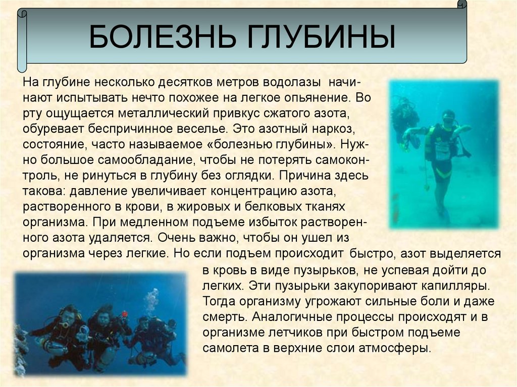 БОЛЕЗНЬ ГЛУБИНЫНа глубине несколько десятков метров водолазы начинают испытывать нечто похожее на легкое опьянение. Во
