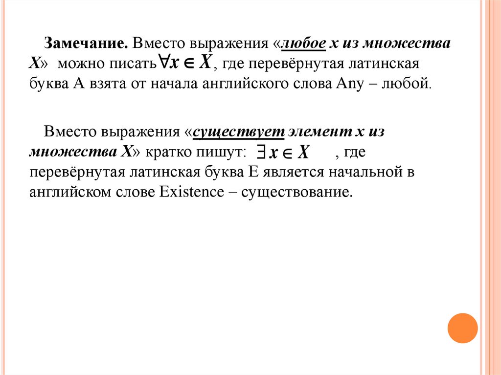 Замечание. Вместо выражения «любое х из множестваХ» можно писать x X , где перевёрнутая латинская