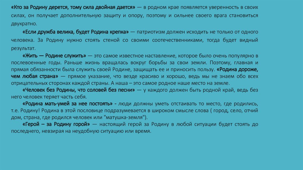 «Кто за Родину дерется, тому сила двойная дается» — в родном крае появляется уверенность в своихсилах, он получает дополнительную защиту и опору, поэтому и сильнее своего врага становиться