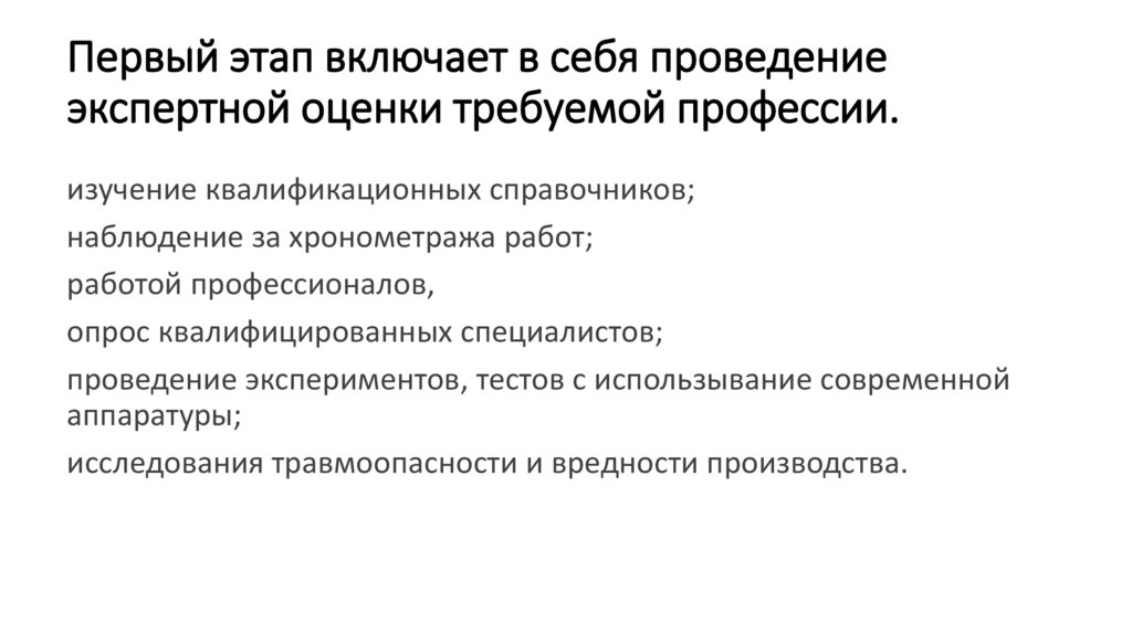 Первый этап включает в себя проведениеэкспертной оценки требуемой профессии.