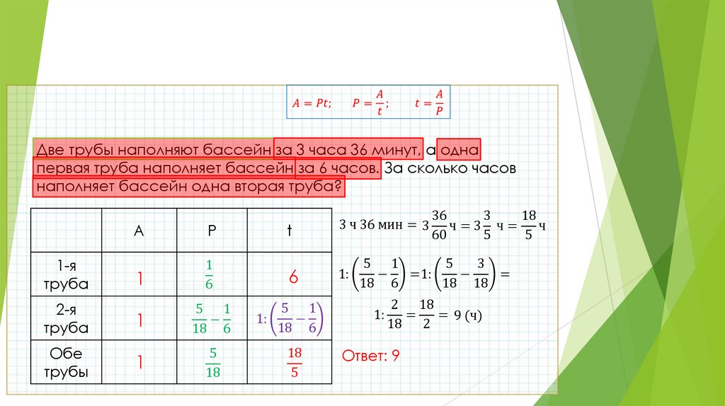 • Задача 1Две трубы наполняют бассейн за 3 часа 36 минут, а одна первая труба наполняет