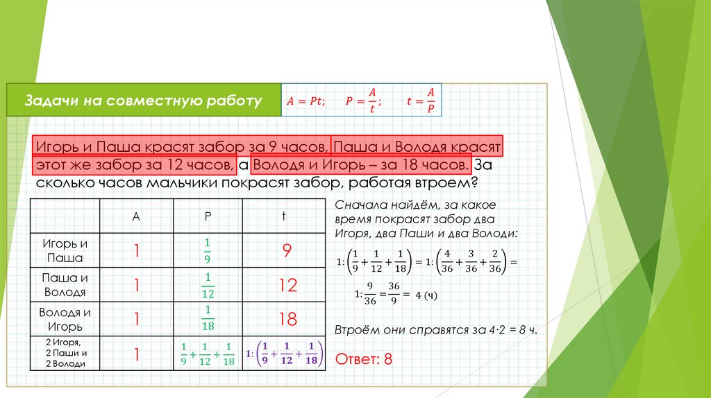 а Володя и Игорь – за 18 часов. За сколько часов мальчики покрасят забор, работая