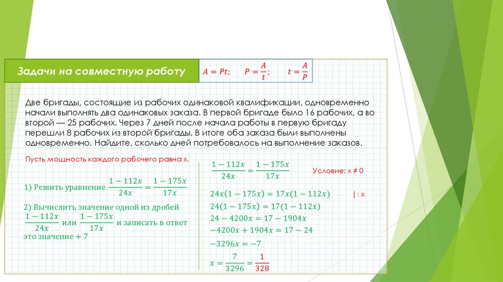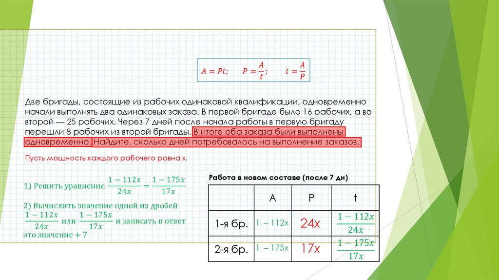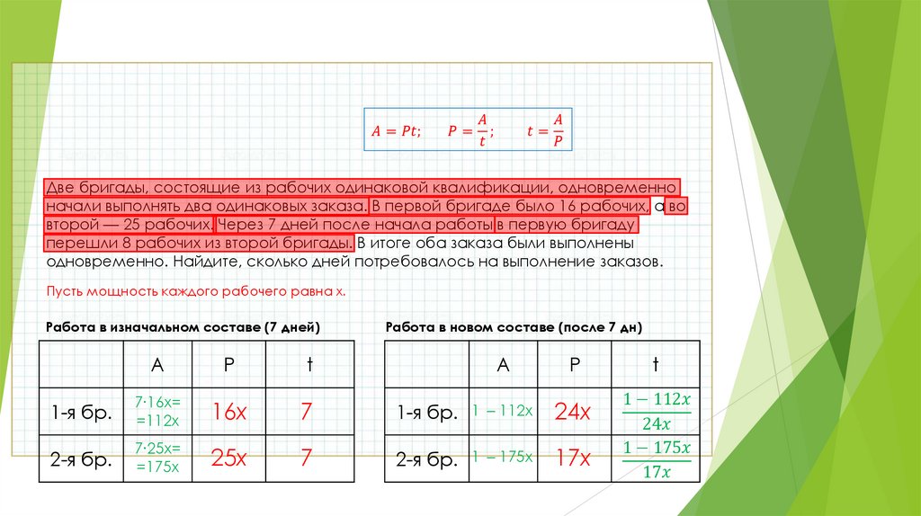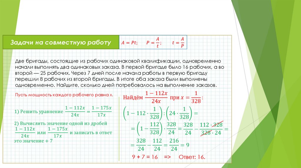 выполнять два одинаковых заказа. В первой бригаде было 16 рабочих, а во второй — 25