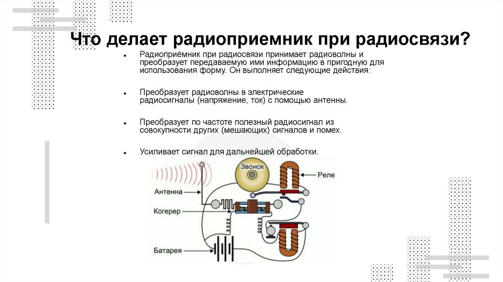 Что делает радиоприемник при радиосвязи?Радиоприёмник при радиосвязи принимает радиоволны и