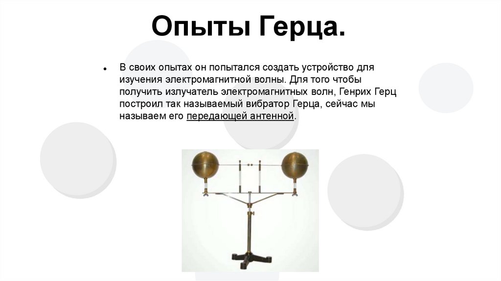 Опыты Герца.В своих опытах он попытался создать устройство для