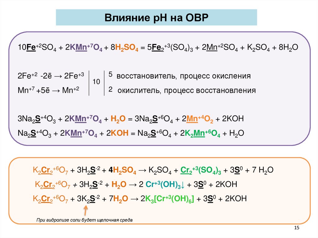 Влияние рН на ОВР10Fe+2SO4 + 2KMn+7O4 + 8H2SO4 = 5Fe2+3(SO4)3 + 2Mn+2SO4 + K2SO4 + 8H2O
