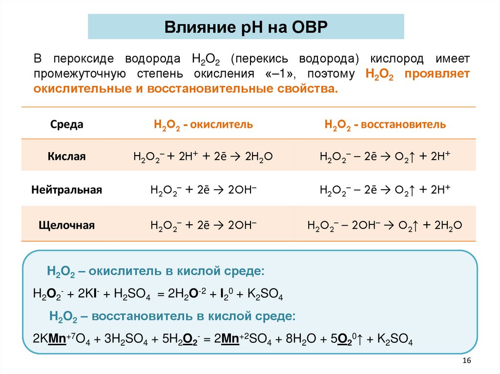 Влияние рН на ОВРВ пероксиде водорода H2O2 (перекись водорода) кислород имеет