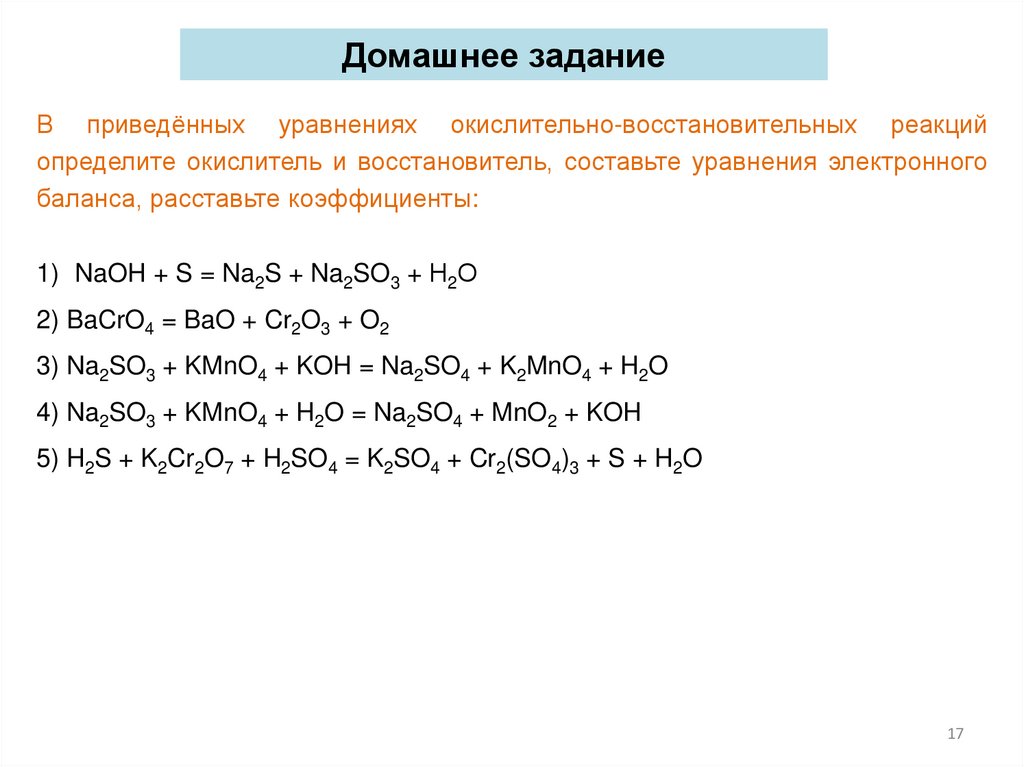 Домашнее заданиеВ приведённых уравнениях окислительно-восстановительных реакций