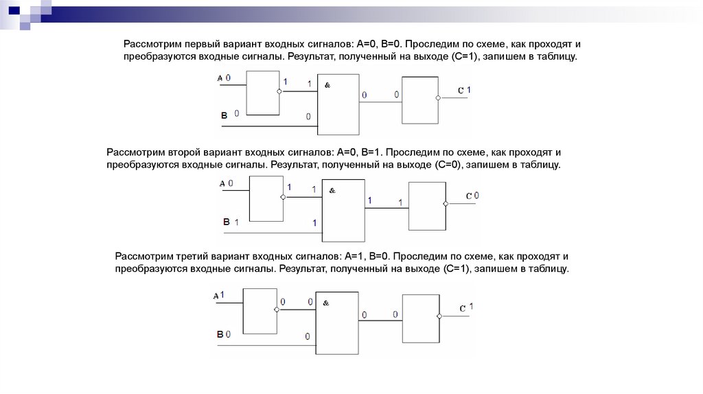 Рассмотрим первый вариант входных сигналов: А=0, В=0. Проследим по схеме, как проходят ипреобразуются входные сигналы. Результат, полученный на выходе (С=1), запишем в таблицу.