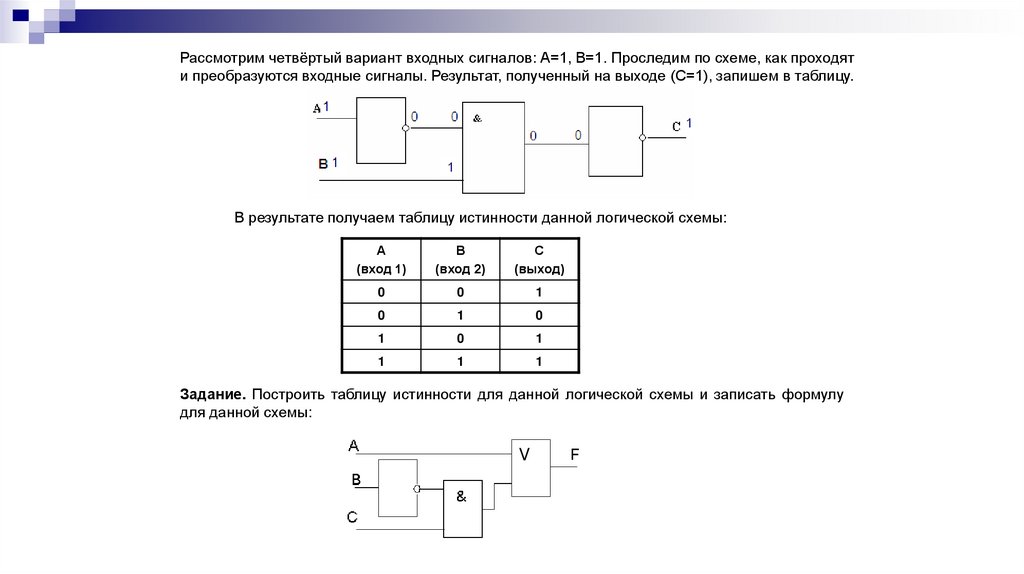 Рассмотрим четвёртый вариант входных сигналов: А=1, В=1. Проследим по схеме, как проходяти преобразуются входные сигналы. Результат, полученный на выходе (С=1), запишем в таблицу.