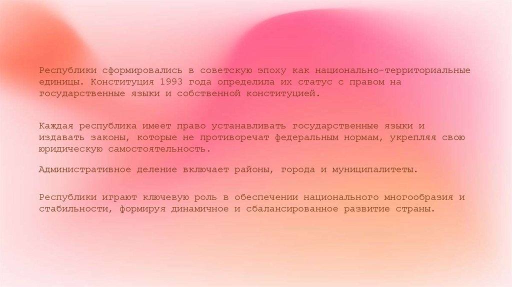 Республики сформировались в советскую эпоху как национально-территориальныеединицы. Конституция 1993 года определила их статус с правом на