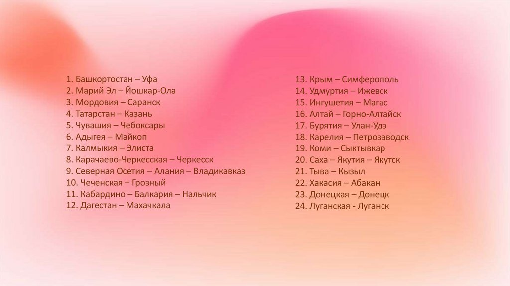1. Башкортостан – Уфа2. Марий Эл – Йошкар-Ола