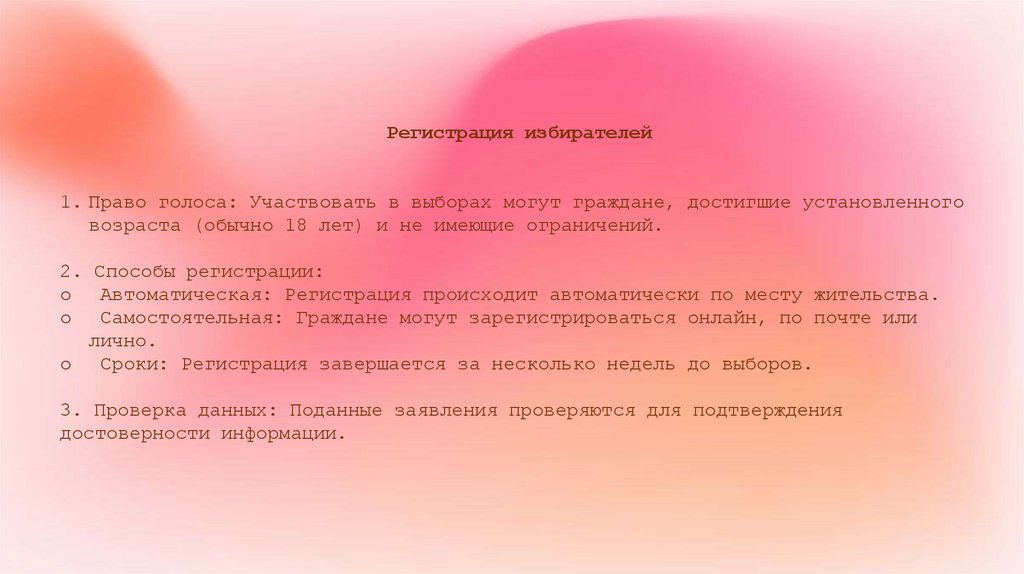 Регистрация избирателей1. Право голоса: Участвовать в выборах могут граждане, достигшие установленного