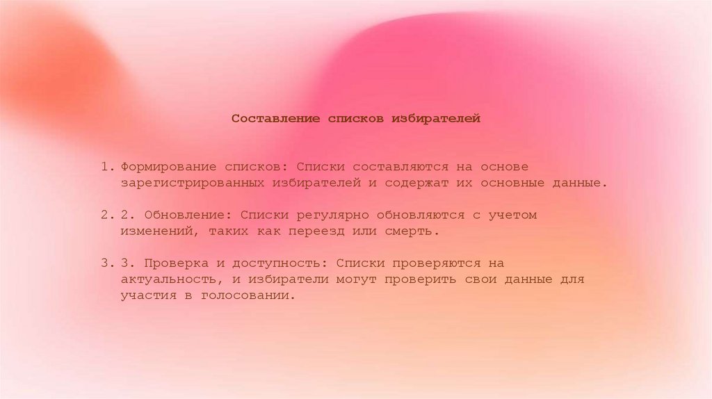 Составление списков избирателей1. Формирование списков: Списки составляются на основе