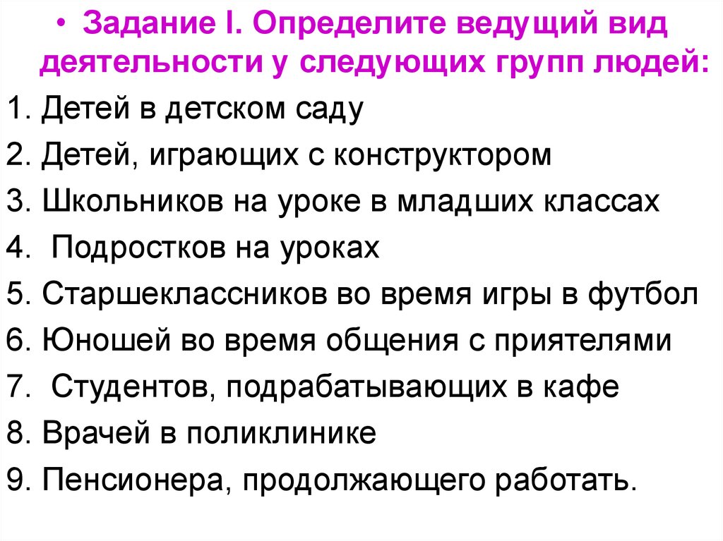 • Задание I. Определите ведущий виддеятельности у следующих групп людей:
