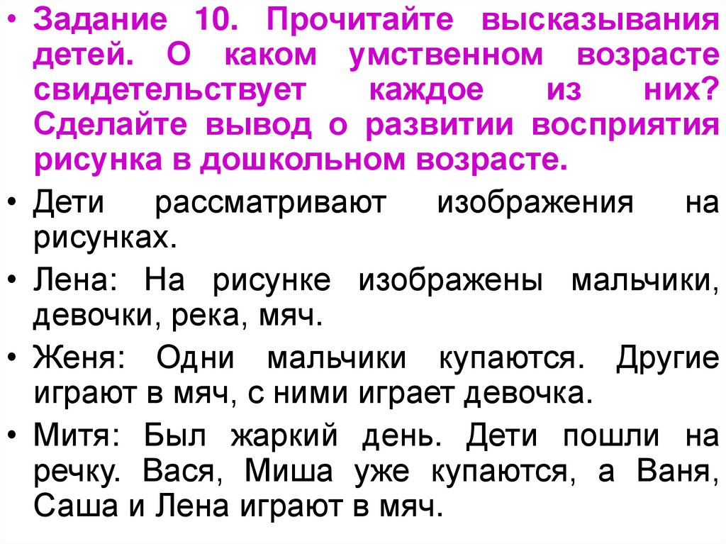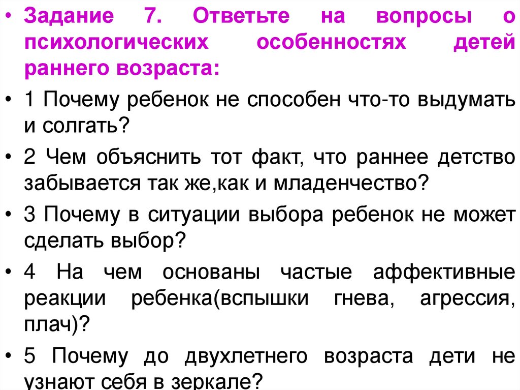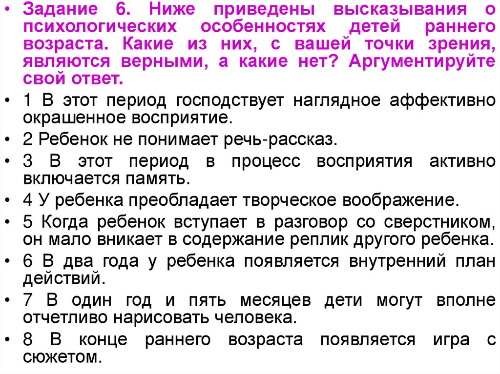 • Задание 6. Ниже приведены высказывания опсихологических особенностях детей раннего