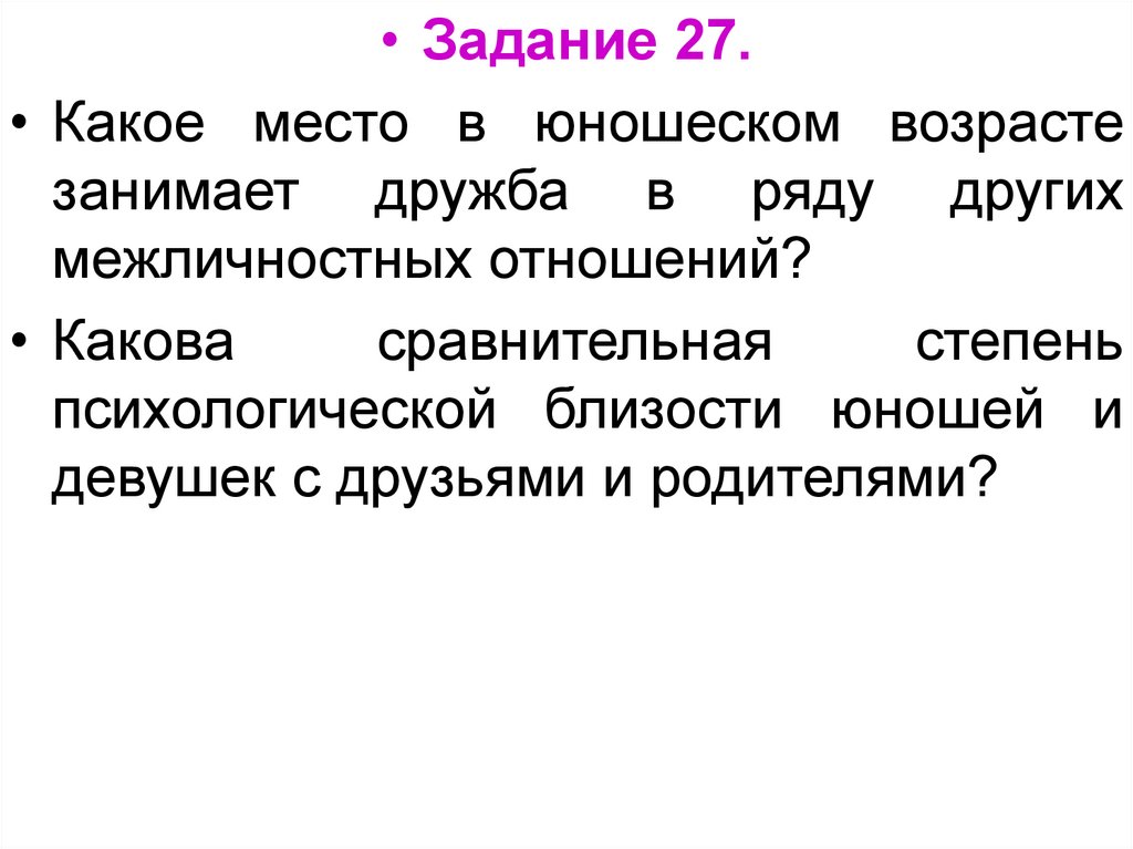 • Задание 27.• Какое место в юношеском возрасте