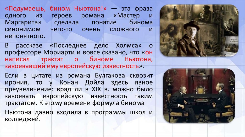 «Подумаешь, бином Ньютона!» — эта фразаодного из героев романа «Мастер и