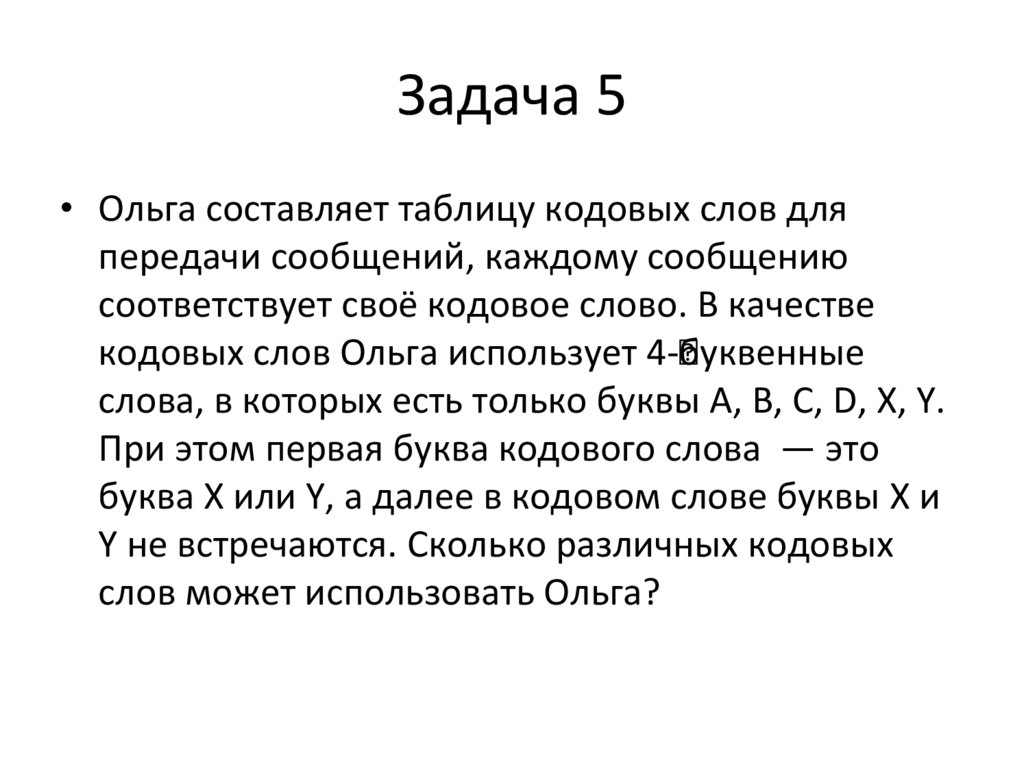 Задача 5• Ольга составляет таблицу кодовых слов для