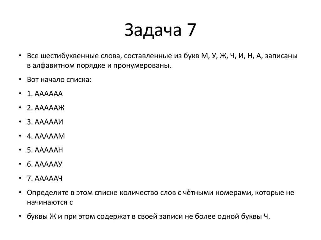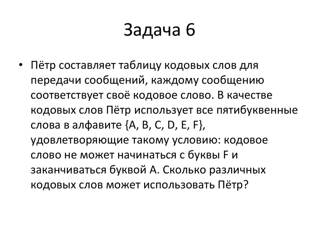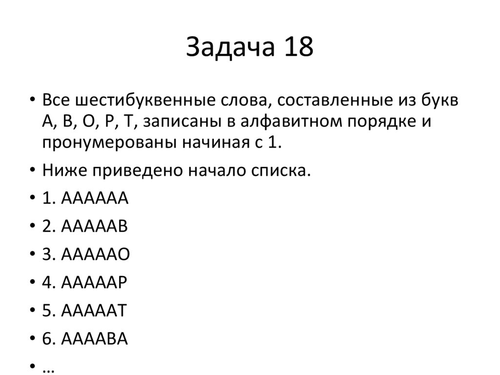 Задача 18• Все шестибуквенные слова, составленные из букв