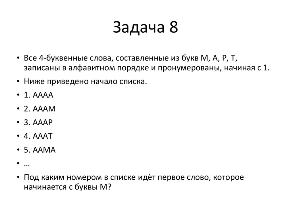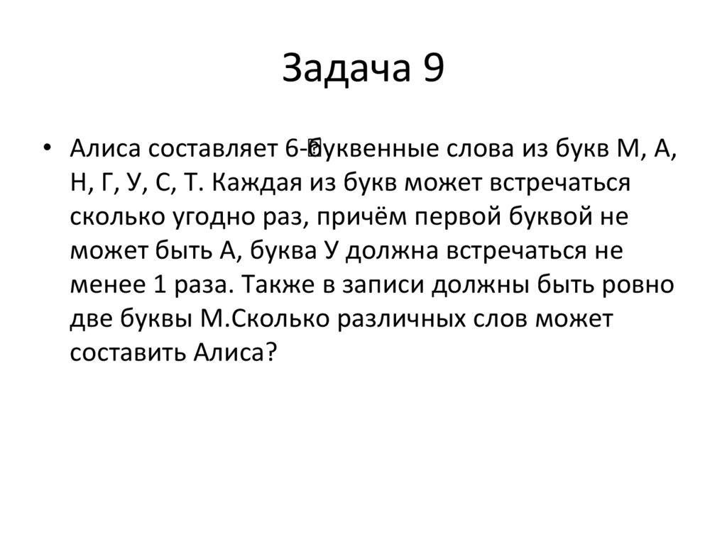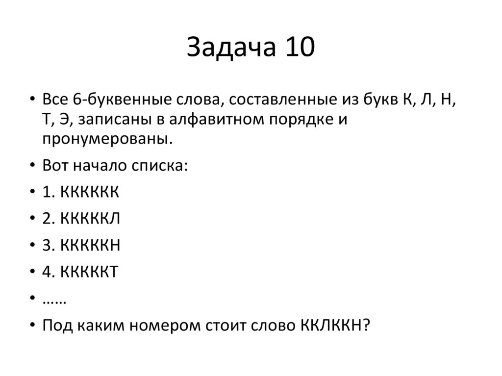 Задача 10• Все 6-буквенные слова, составленные из букв К, Л, Н,
