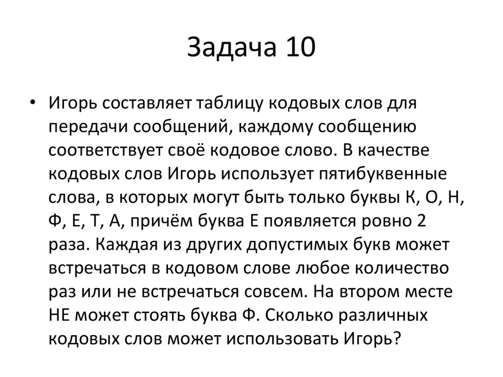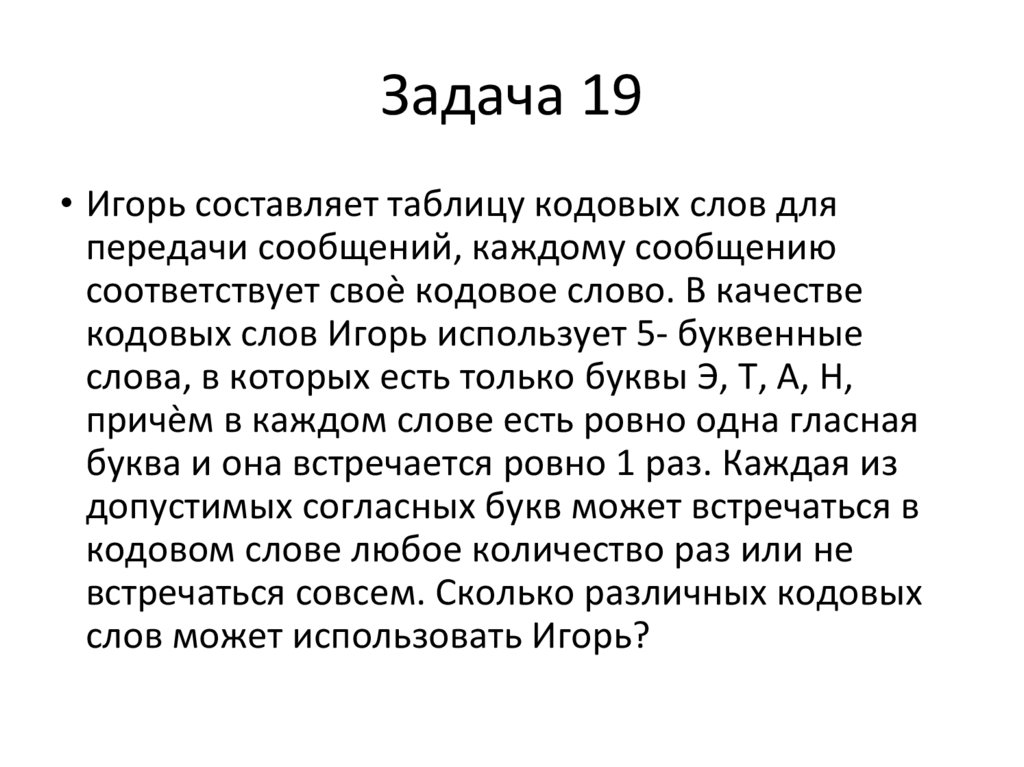 Задача 19• Игорь составляет таблицу кодовых слов для