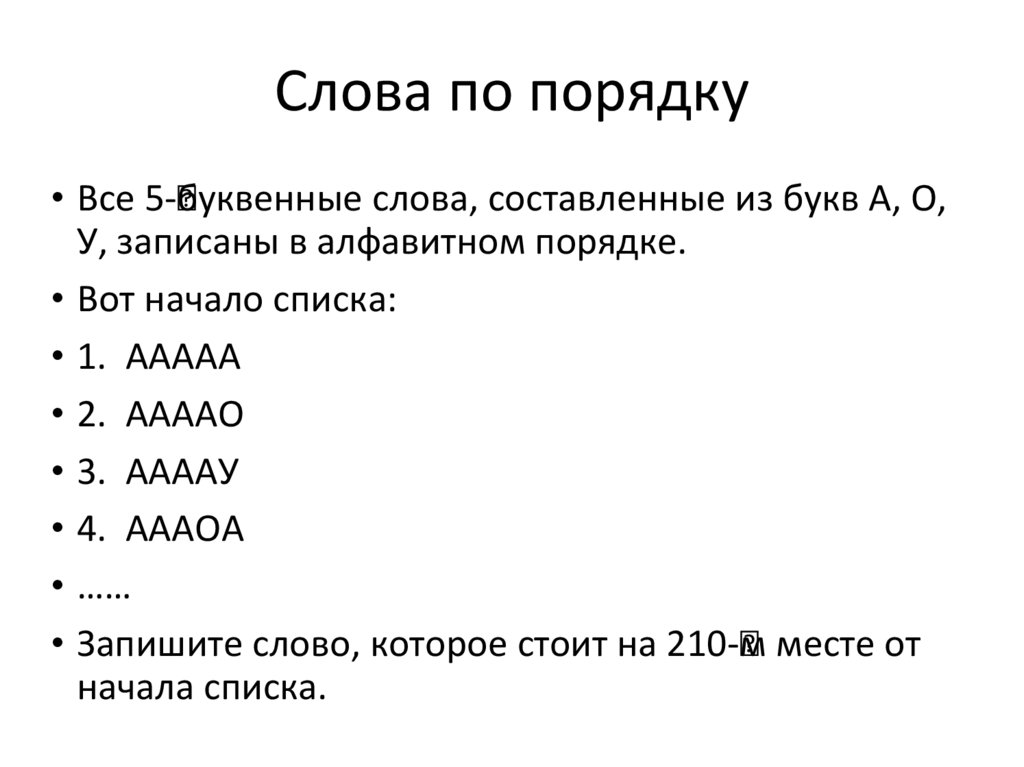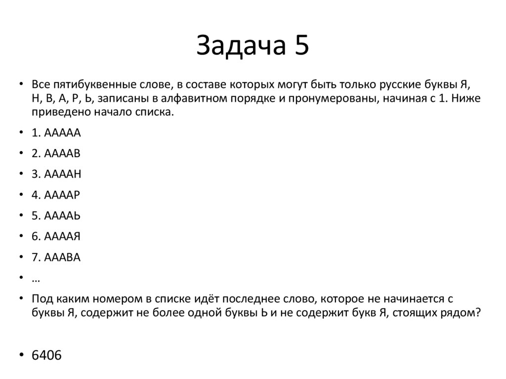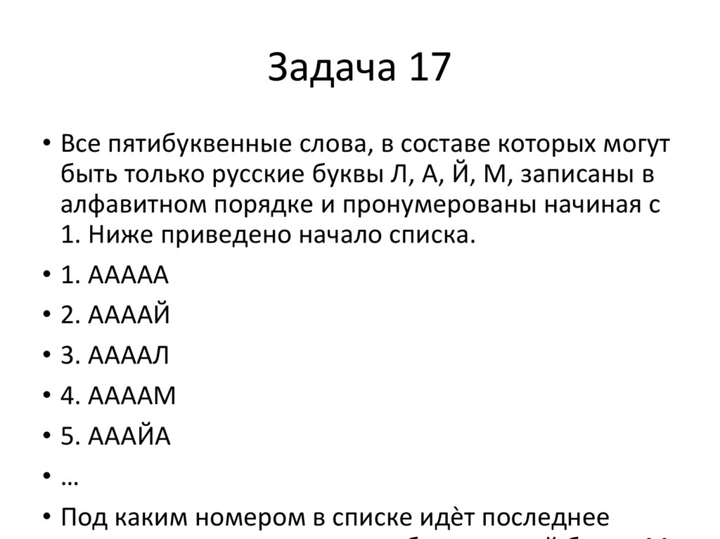 Задача 17• Все пятибуквенные слова, в составе которых могут