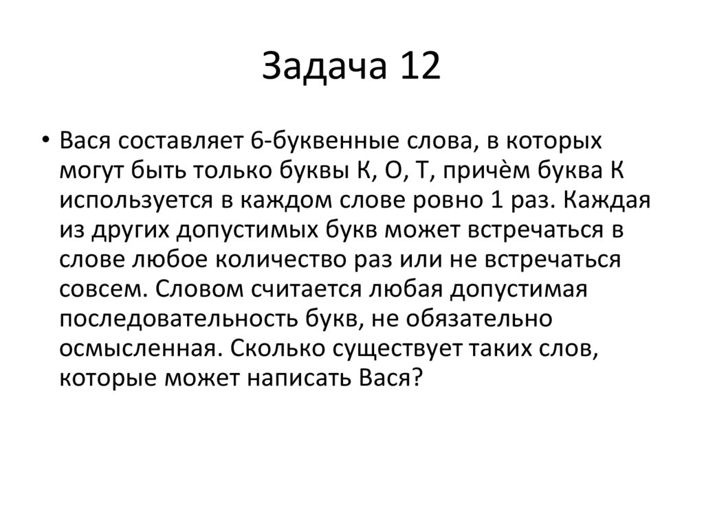Задача 12• Вася составляет 6-буквенные слова, в которых