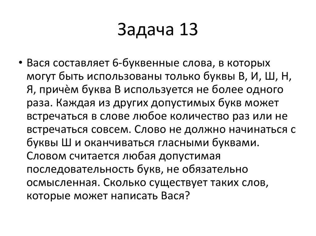 Задача 13• Вася составляет 6-буквенные слова, в которых