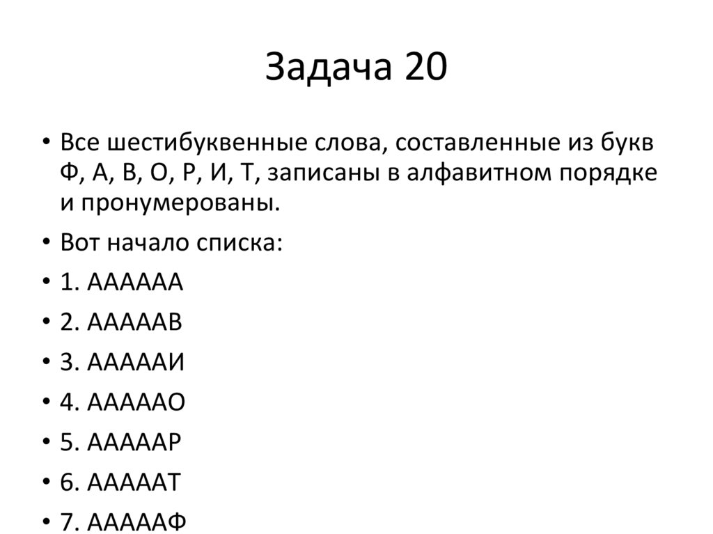 Задача 20• Все шестибуквенные слова, составленные из букв