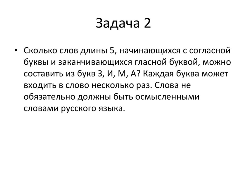 Задача 2• Сколько слов длины 5, начинающихся с согласной