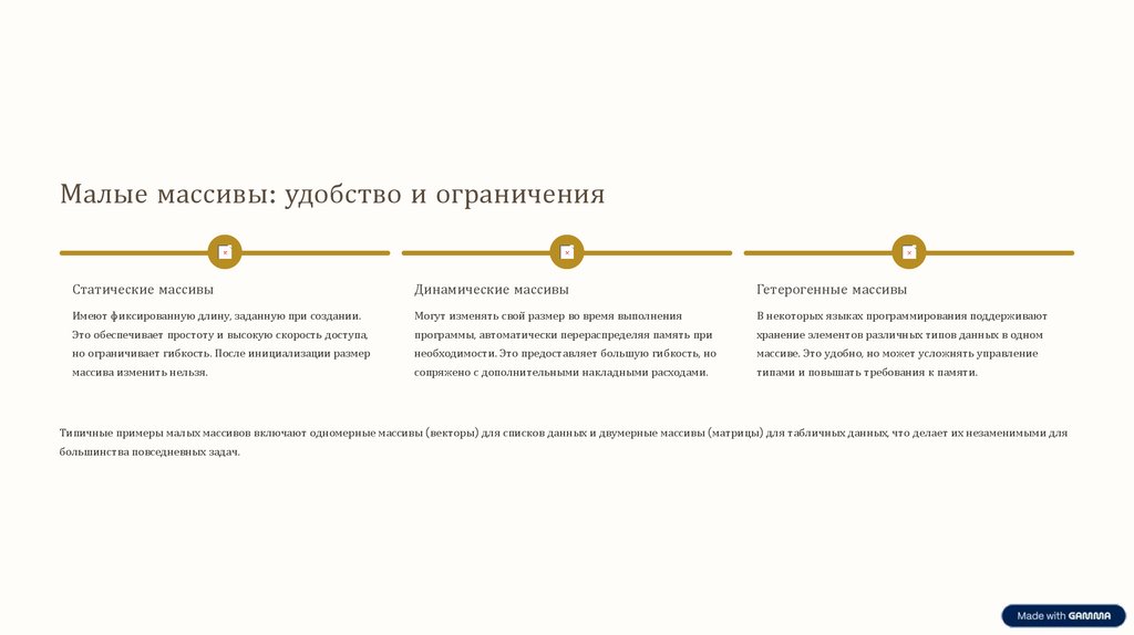 Типичные примеры малых массивов включают одномерные массивы (векторы) для списков данных и двумерные массивы (матрицы) для табличных данных, что делает их незаменимыми для