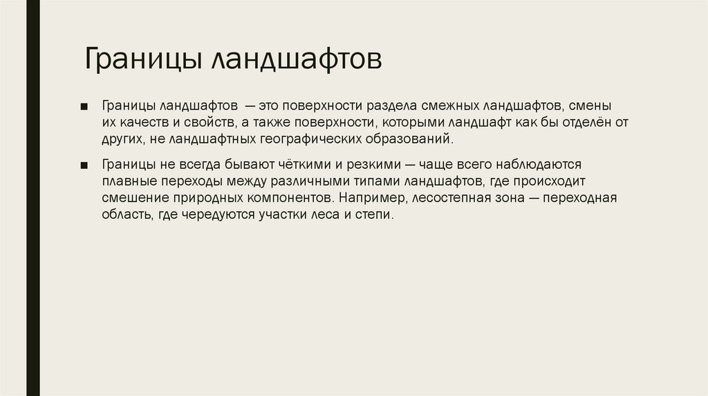 ■ Границы ландшафтов — это поверхности раздела смежных ландшафтов, сменыих качеств и свойств, а также поверхности, которыми ландшафт как бы отделён от