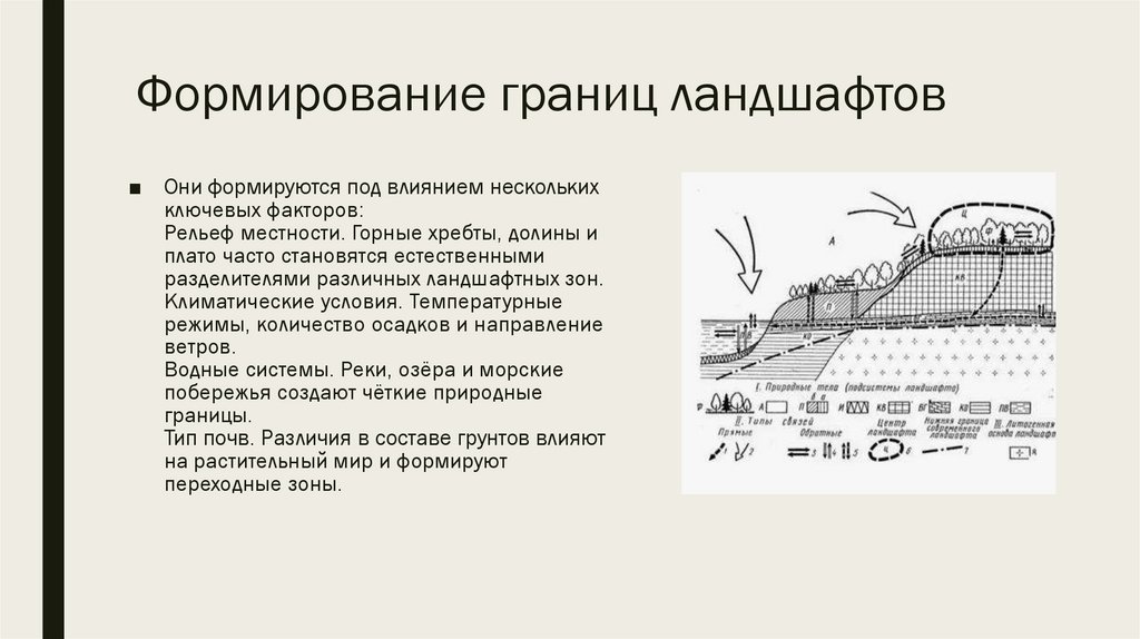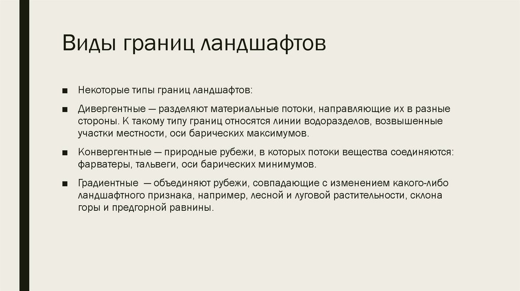 ■ Некоторые типы границ ландшафтов:■ Дивергентные — разделяют материальные потоки, направляющие их в разные