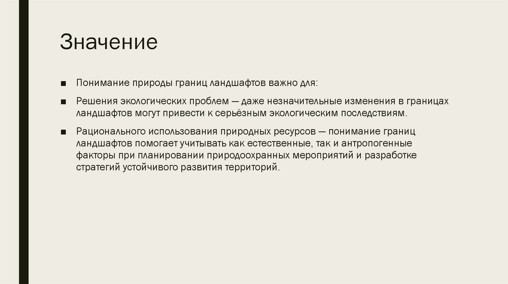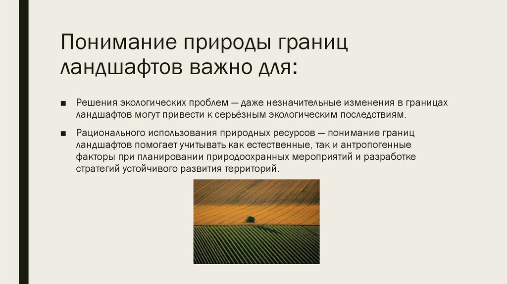 ■ Понимание природы границ ландшафтов важно для:■ Решения экологических проблем — даже незначительные изменения в границах