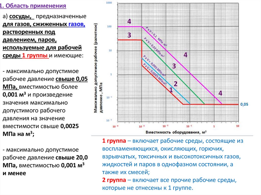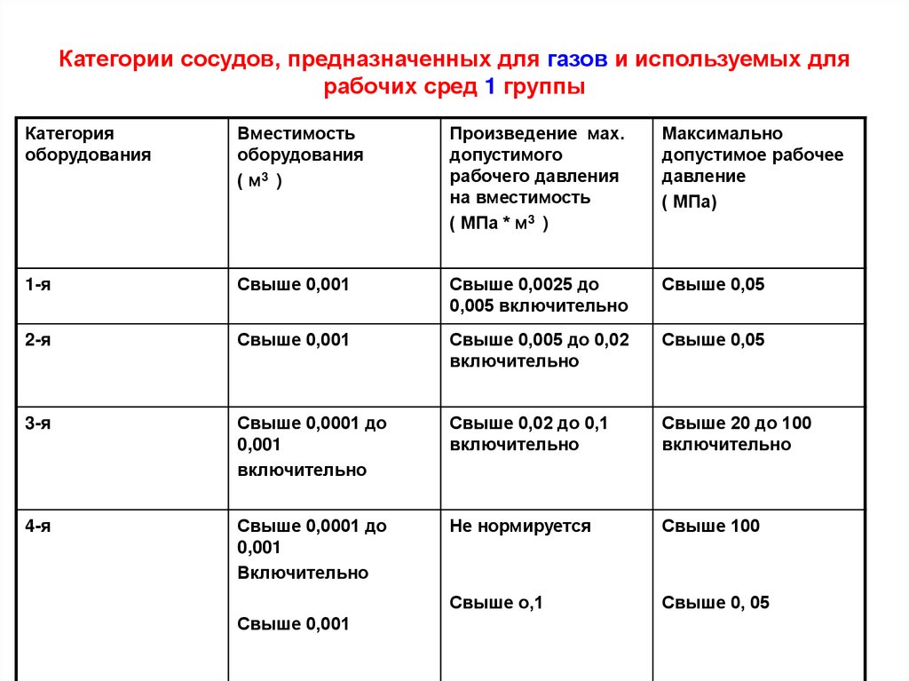 1. Категории сосудов, предназначенных для газов и используемых для рабочих сред 1 группы