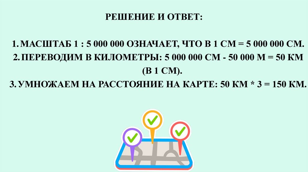 3. УМНОЖАЕМ НА РАССТОЯНИЕ НА КАРТЕ: 50 КМ * 3 = 150 КМ.