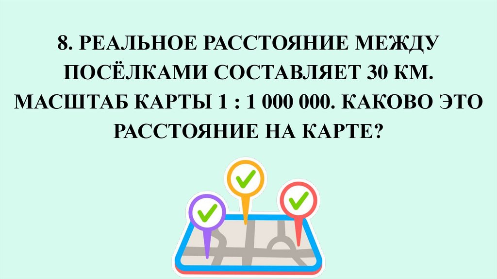 8. РЕАЛЬНОЕ РАССТОЯНИЕ МЕЖДУПОСЁЛКАМИ СОСТАВЛЯЕТ 30 КМ.