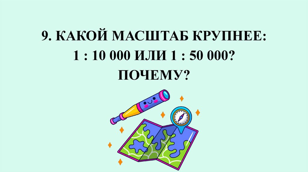 9. КАКОЙ МАСШТАБ КРУПНЕЕ:1 : 10 000 ИЛИ 1 : 50 000?