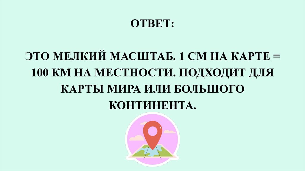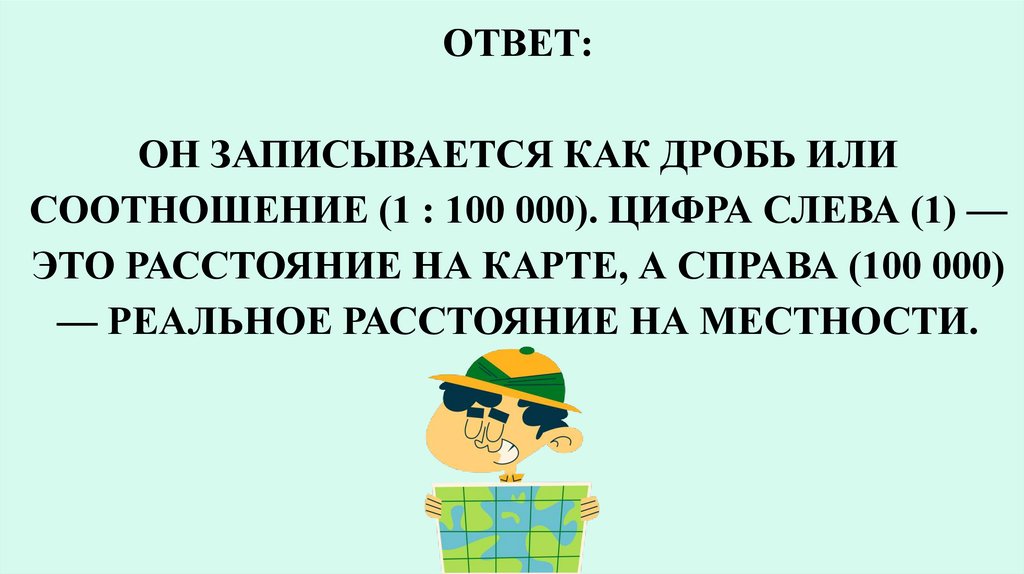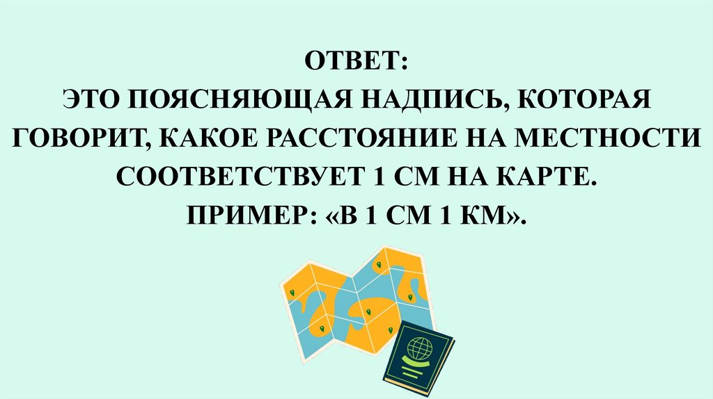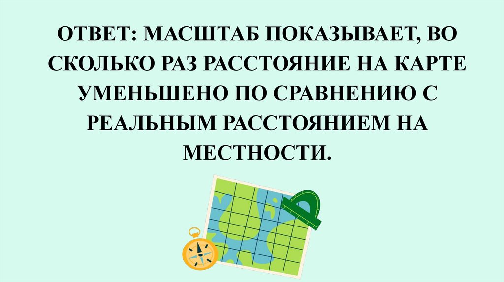 ОТВЕТ: МАСШТАБ ПОКАЗЫВАЕТ, ВОСКОЛЬКО РАЗ РАССТОЯНИЕ НА КАРТЕ