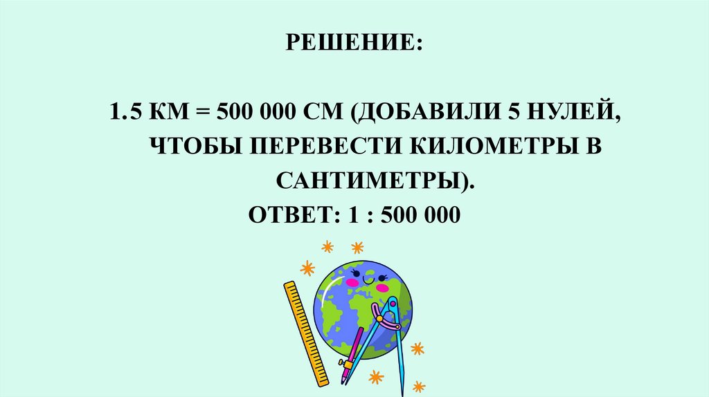 РЕШЕНИЕ:1.5 КМ = 500 000 СМ (ДОБАВИЛИ 5 НУЛЕЙ,