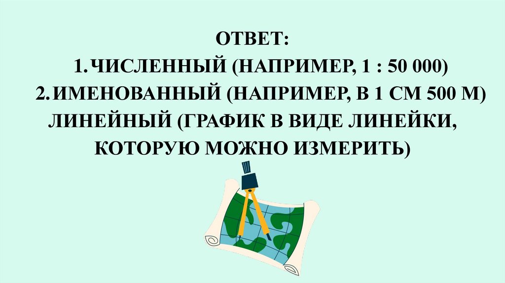 ОТВЕТ:1.ЧИСЛЕННЫЙ (НАПРИМЕР, 1 : 50 000)