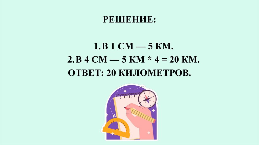 2. В 4 СМ — 5 КМ * 4 = 20 КМ.