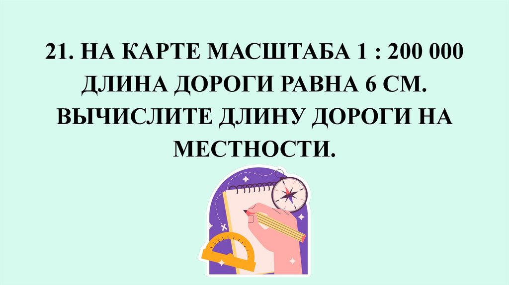 21. НА КАРТЕ МАСШТАБА 1 : 200 000ДЛИНА ДОРОГИ РАВНА 6 СМ.