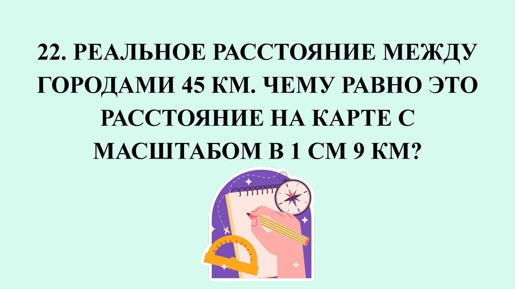 22. РЕАЛЬНОЕ РАССТОЯНИЕ МЕЖДУГОРОДАМИ 45 КМ. ЧЕМУ РАВНО ЭТО