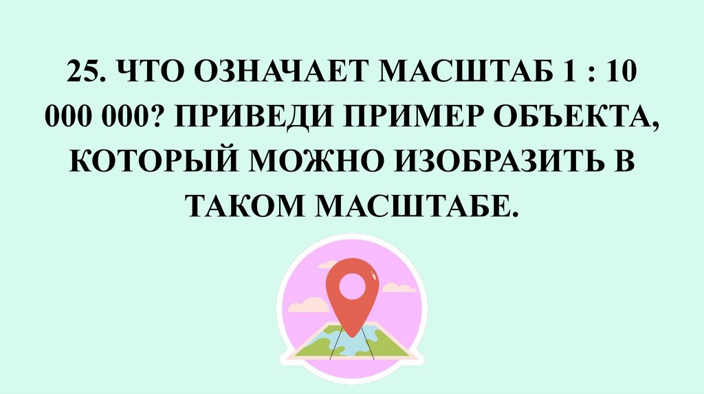 25. ЧТО ОЗНАЧАЕТ МАСШТАБ 1 : 10000 000? ПРИВЕДИ ПРИМЕР ОБЪЕКТА,
