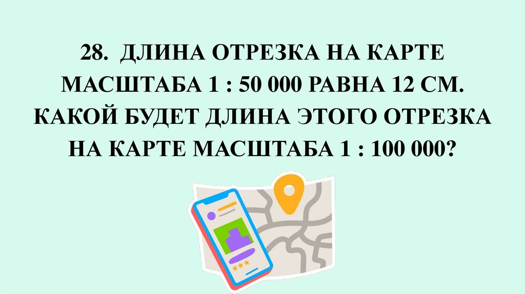 28. ДЛИНА ОТРЕЗКА НА КАРТЕМАСШТАБА 1 : 50 000 РАВНА 12 СМ.