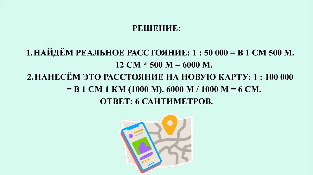 РЕШЕНИЕ:1. НАЙДЁМ РЕАЛЬНОЕ РАССТОЯНИЕ: 1 : 50 000 = В 1 СМ 500 М.