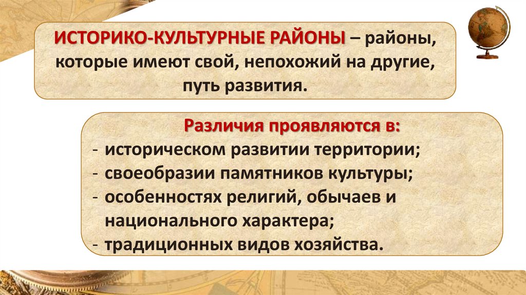 ИСТОРИКО-КУЛЬТУРНЫЕ РАЙОНЫ – районы,которые имеют свой, непохожий на другие,